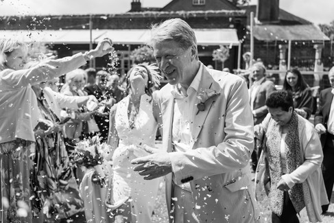 The weather was a typical British summer day, changing between sunshine and rain, so the ceremony took place indoors. It was a beautiful and intimate moment, followed by a fun confetti celebration outside once the rain stopped.